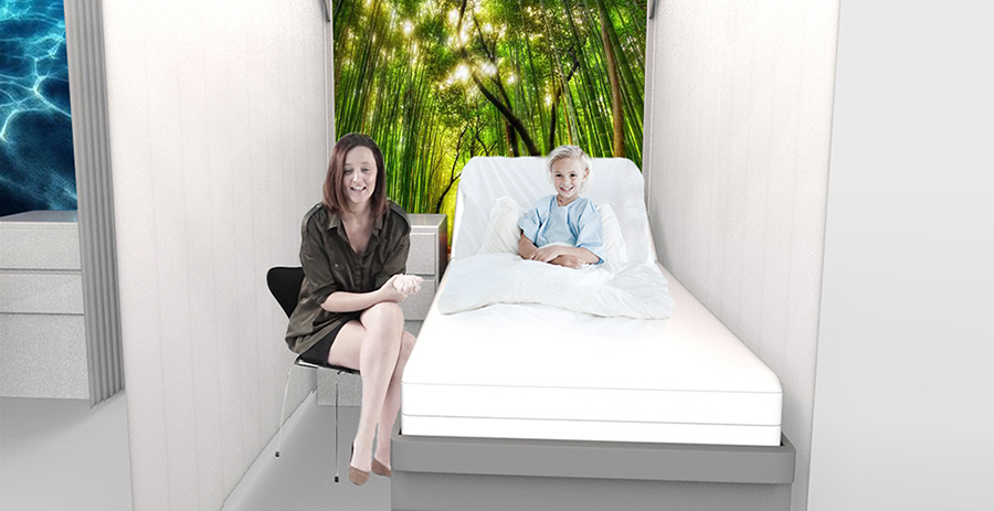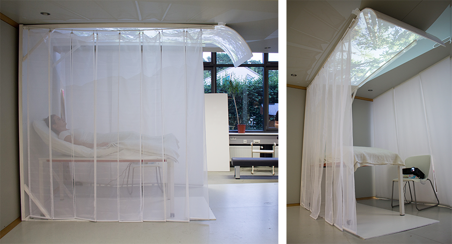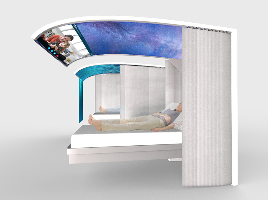 A sort of a baldachin together with curtains creates a space to calm down, feel well and have privacy for the patient himself and also for visits of the doctor or relatives. A display over the whole surface can screen atmospheric pictures or applications (available in an App-Store), which additionally stimulate and entertain the patient.
