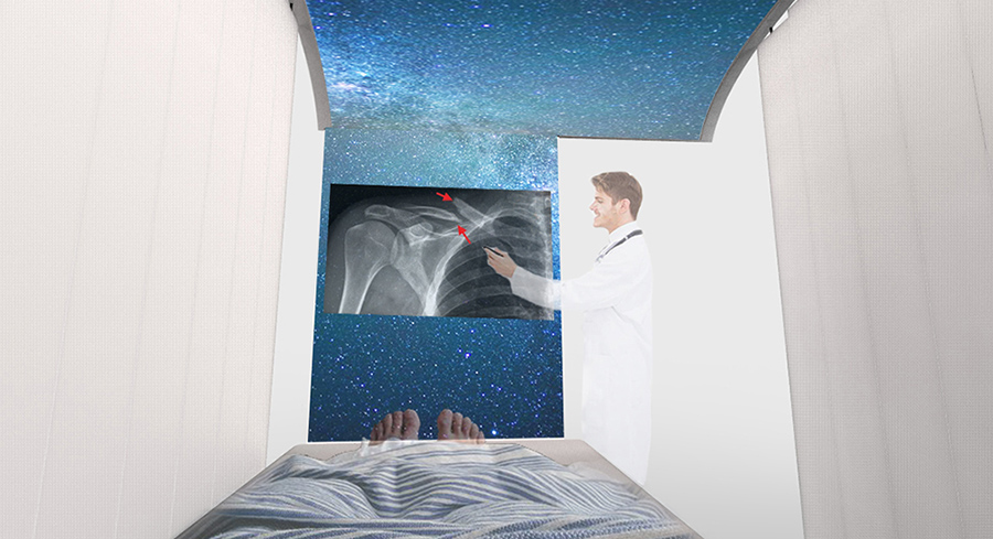 This product not only finds its usage in hospitals, it suits perfectly for rest and waiting areas at airports, public places or offices. It might even be interesting for private use - because who doesn’t like the possibility to relaxe under the night sky, a leaf canopy or a sunset?