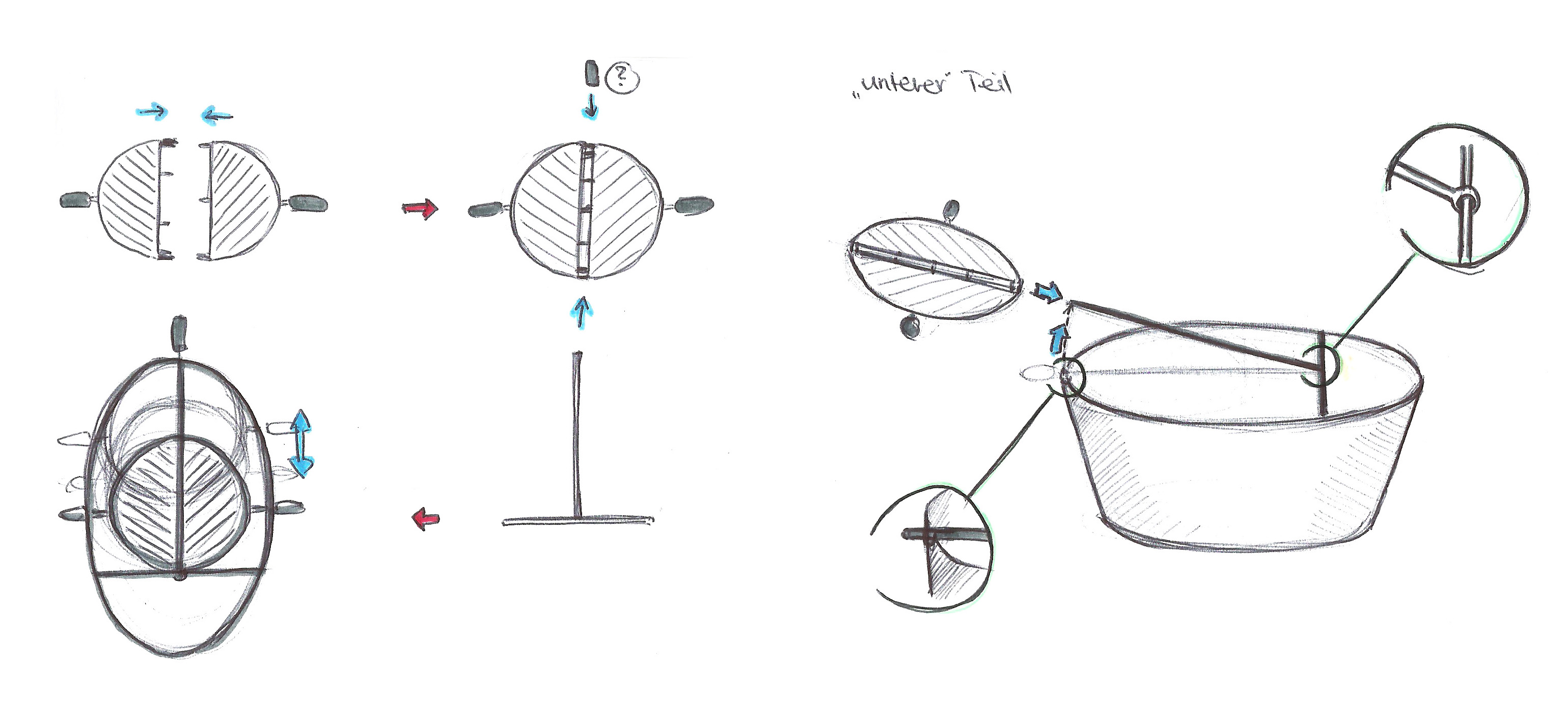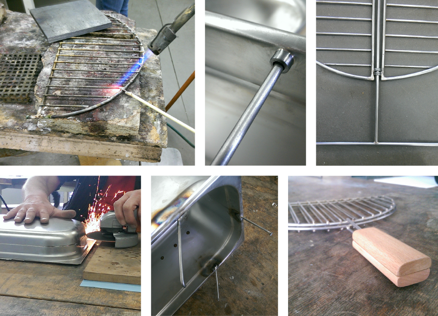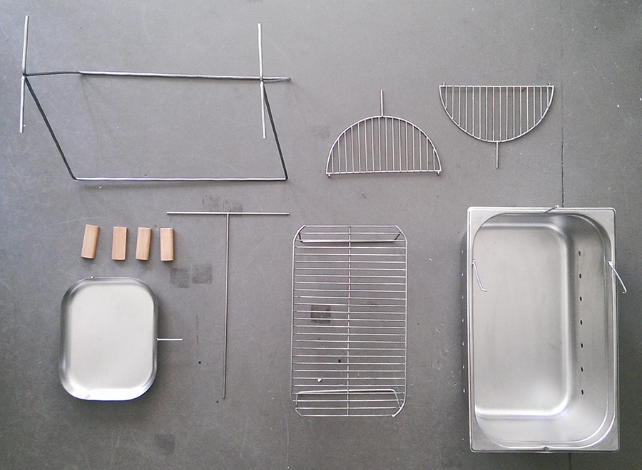 Due to the two components of this dish (the flat bread and the filling) the grill required two different grill surfaces. After gathering and sketching ideas of possibilities to integrate the two surfaces we agreed on putting the following variant into practice: Our model should consist of a basin for the coal, a grillage for the flat bread and a shovel for the filling.
