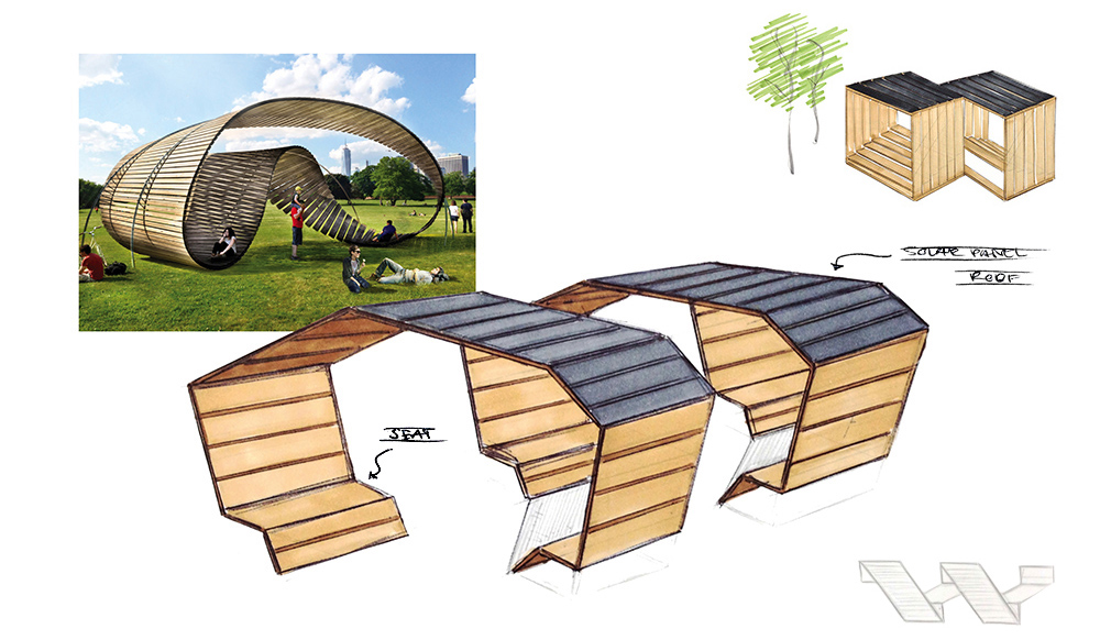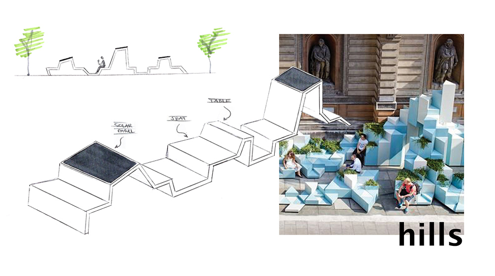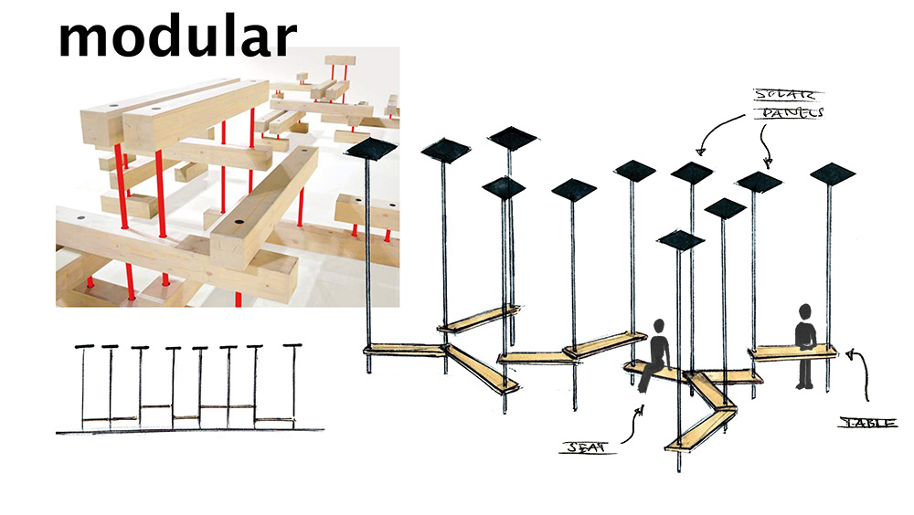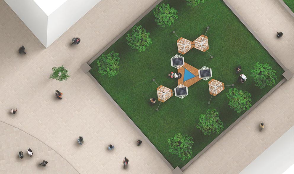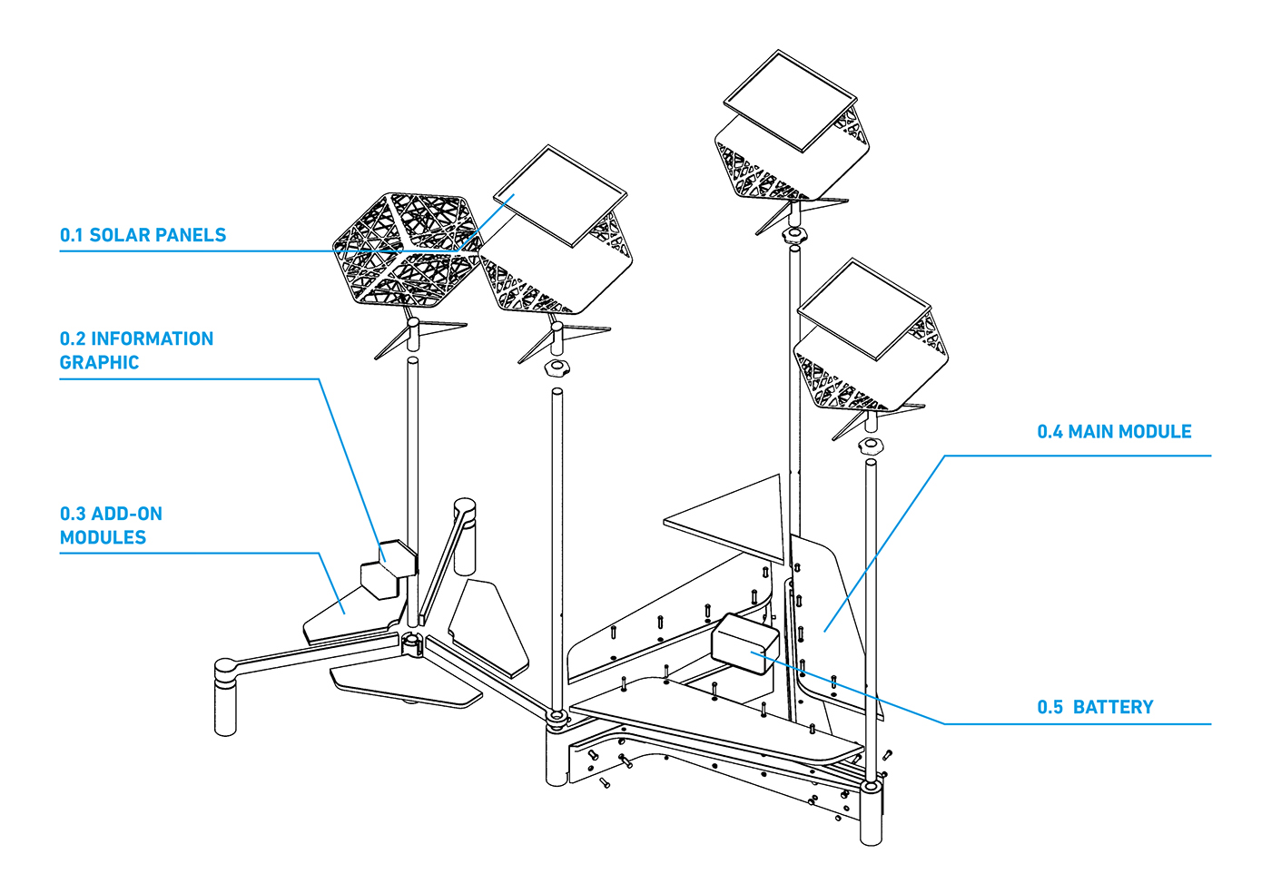 As a solution we came up with a modular and very open design, which provides shadow and seating accommodations as well as information graphics about solar power. Being able to work as one single module as well as in combination with many more, it can be attached to many places and creates an interesting and playful surrounding.