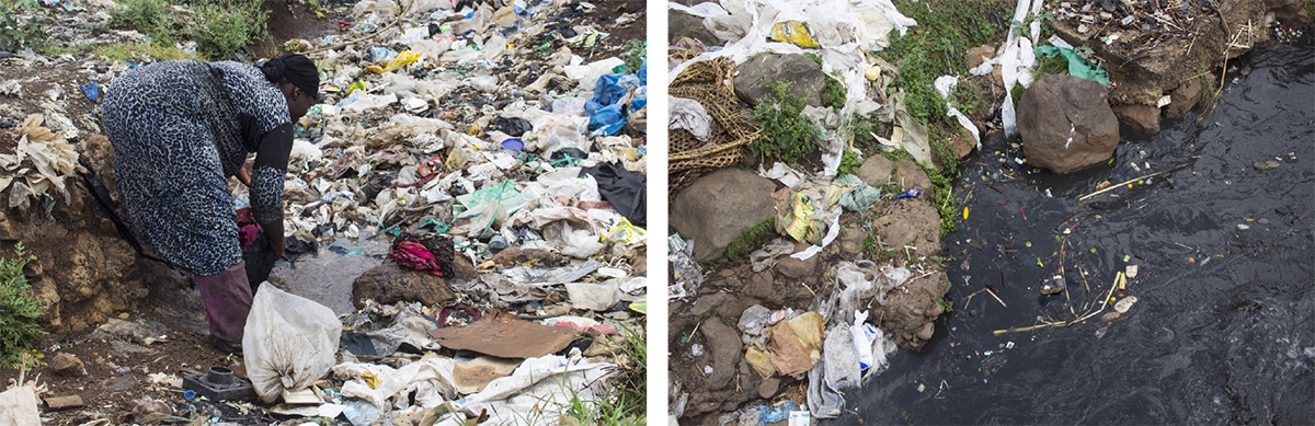 As we reach the Nairobi River, which passes through the dumpsite, the boys joke around, saying „If you‘d throw a fish in there, it probably won‘t even survive for one minute“. At the same time I see women washing their clothes in the black water.