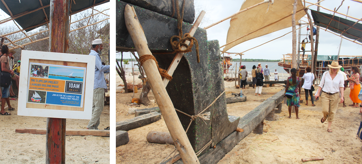 Then we prepared everything for the launch, where the visitors were able to see the first eight recycled plastic pieces for the keel being assembled and to get a feeling for the size of the Flipflopi Dhow and the materials, but also just to inform themselves about the whole project.