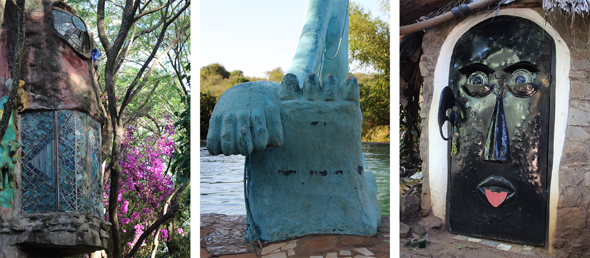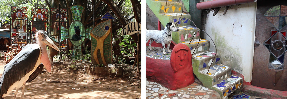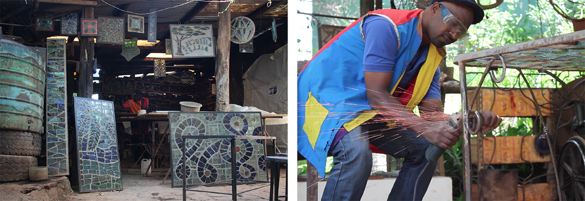 Today, Nani’s Kitengela Glass remains much unchanged. Following the mosaik paths you walk past unusual sculptures, buildings and animals, and every visit brings new discoveries. Between shop, gallery and intricately sculpted sitting areas, you can wander about, watching the artisans work with recycled glass and metal, tin and plastic and turning them into pieces of art.