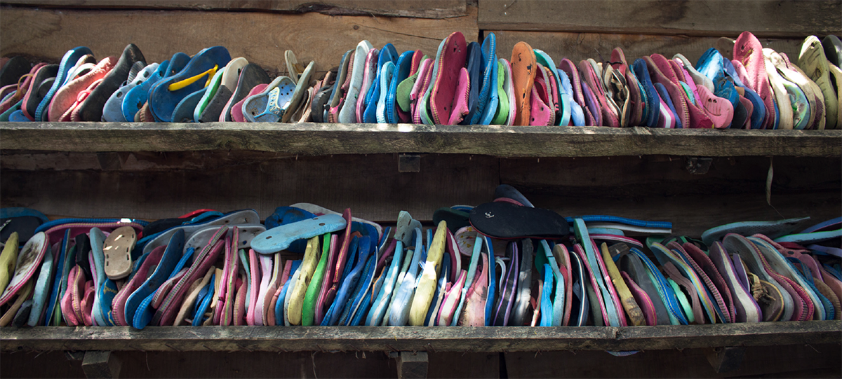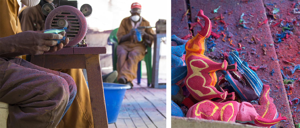 The raw materials that they work with are still collected on Kenya’s beaches and waterways – predominantly rubber flip-flops, which break down very slowly and linger in the environment as tiny plastic pellets even after the flip-flops themselves have disintegrated.